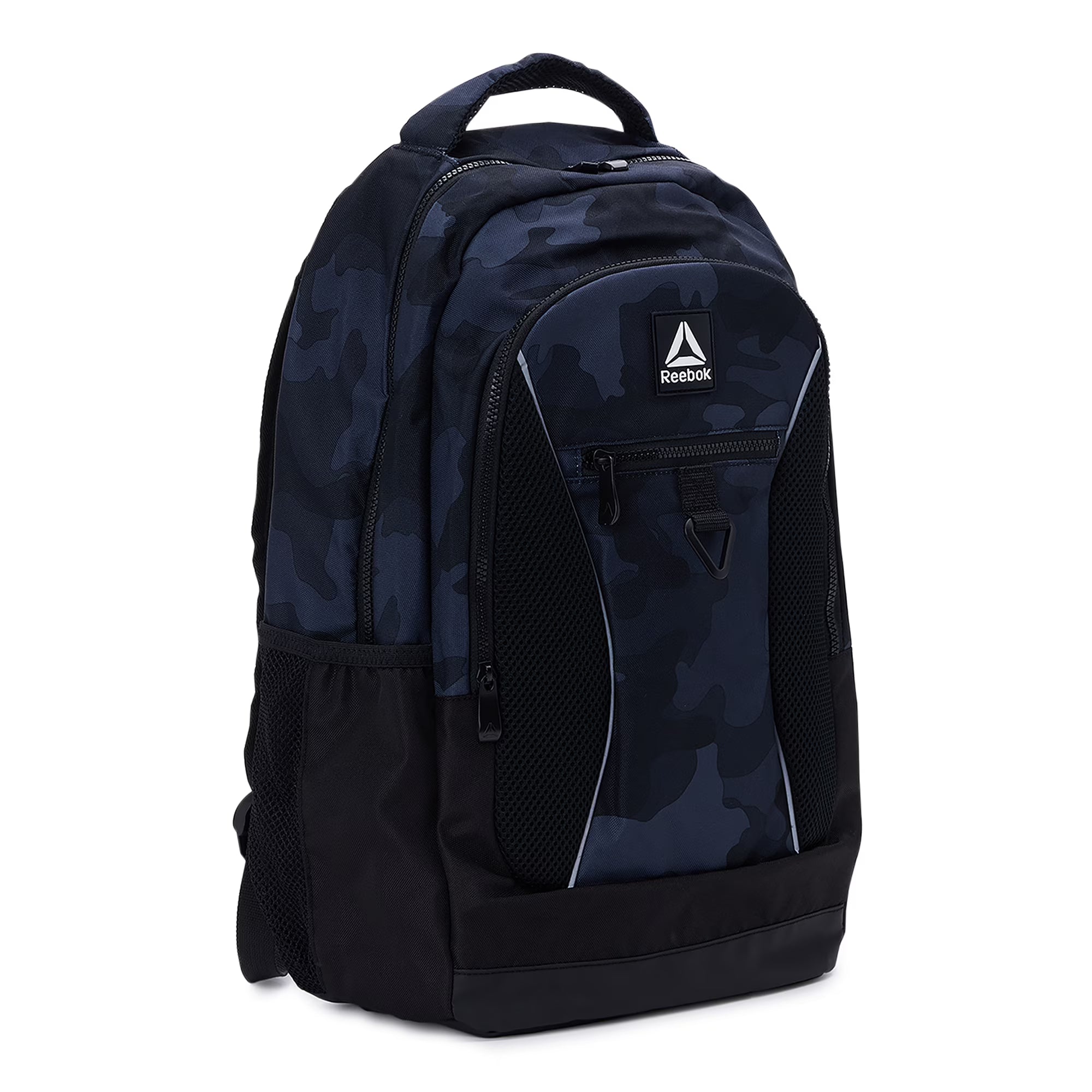 • Exterior Features: Zipper closure; side mesh pockets; padded, adjustable straps; padded mesh top carry handle; key fob; reflective tape; front zipper pocket; camo panels