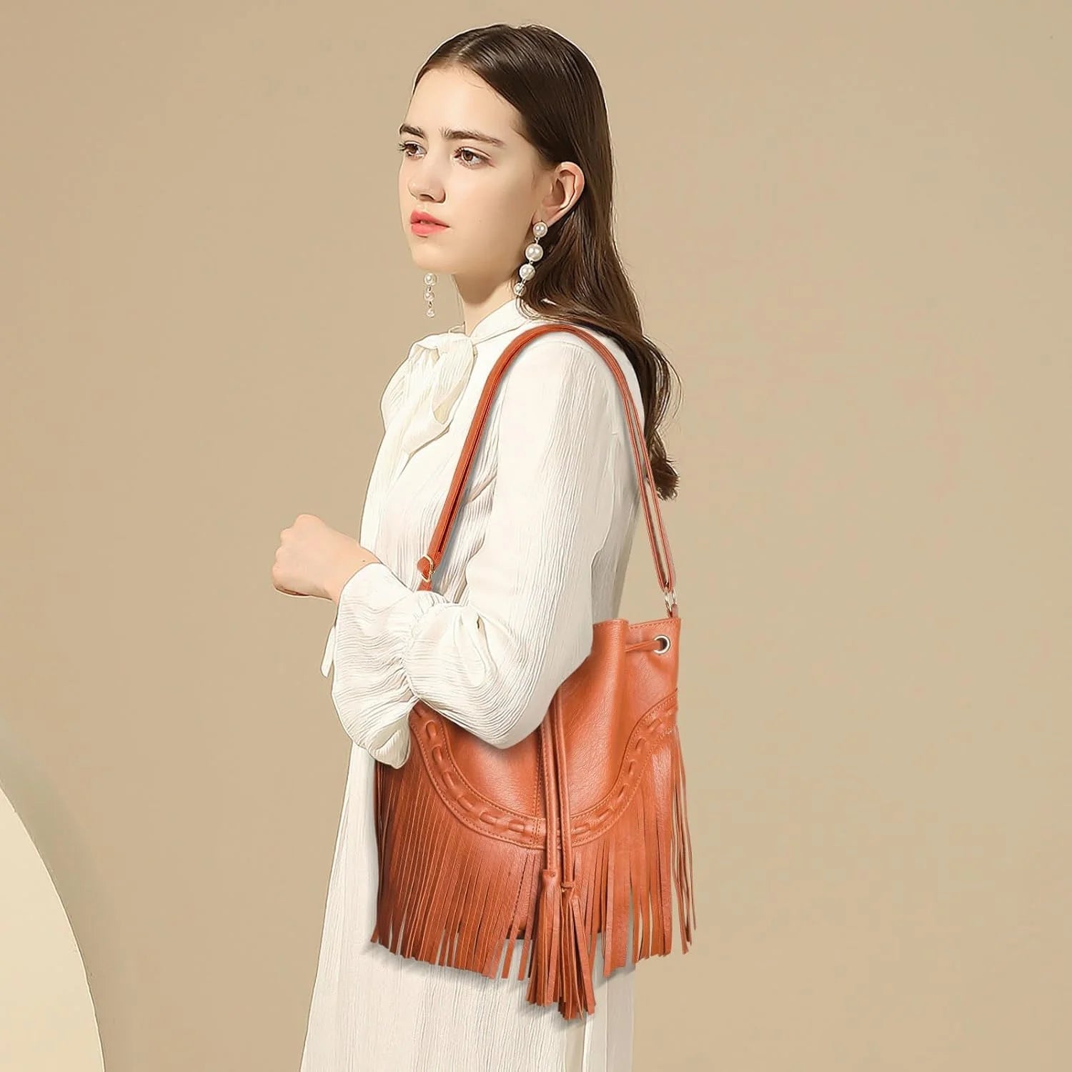 【design】with drawstring and suction closure.the bucket bag opens up to reveal an interior that is 1 zip pocket,2 slip pockets.classic tassel decoration make ladies bags more retro and fashionable.