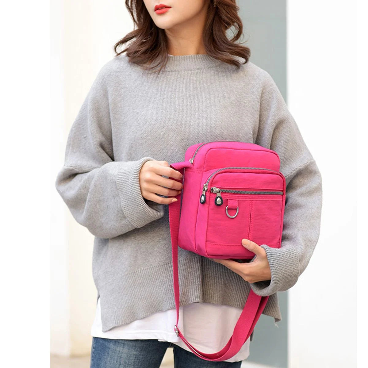 The Gustave multi pockets lightweight shoulder bag is a charming handbag for women's casual outings. There are 5 colors available: black, gray, navy, purple and rose red; measures size 8.2 x 4.7 x 9 inches. This waterproof crossbody bag for ladies is made of polyester lining and water resistant nylon fabrics with classic zippers, smooth and easy to open and close. Structure: Exterior:3 front zipped pockets,1 back zipper pocket; Interior:1 zipper pocket. The number of pockets make it easy to compartmentalize things you need to access quickly and readily without pulling everything out to get at it. Fashionable style, this nylon messenger bag with a variety of storage options and organization features, ideal for travel, errands, shopping, and dating.